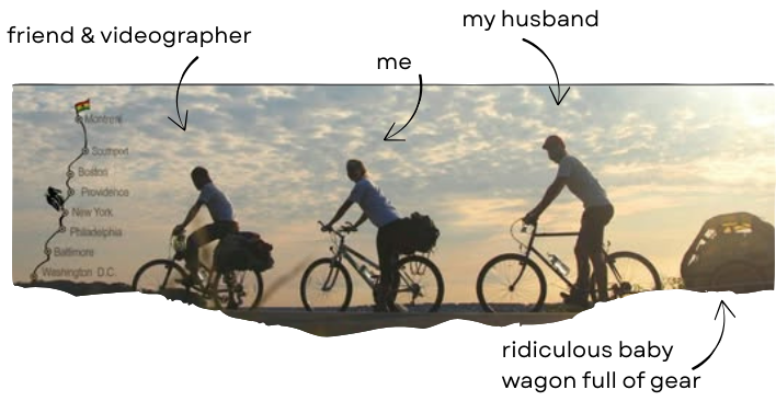 My (now) husband and I biked from Virginia to Montréal on borrowed, semi-busted Mongoose bikes, towing a little wagon with our stuff. No real plan, just purpose driven momentum.